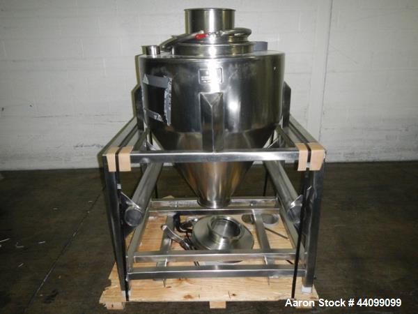 Used Zanchetta (IMA) T Tote Bin, approximately 10.5 cubic feet (300 liter) (79.2 Gallons), Stainless Steel. 40" diameter x 4" straight side x 24" cone bottom. 15 top opening, 6" discharge. Mounted on a stainless steel frame.