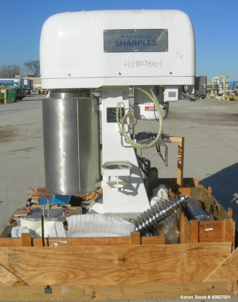 Unused- Sharples SP-725 Super Helix Centrifuge, 316/317 stainless steel. Maximum bowl speed 9000 rpm, 10,000 x "G" force, sanitary design, all contact surfaces polished and free draining, cooling jacket, clean-in-place capability, steam sterilizable to 15 psig at 260 degree, full containment for handling biological or sterile materials, 10 hp main drive with 1 hp backdrive motor. Distinguishing features: sanitary design with polished finishes, biohazard containment, steam sterilized for aseptic operation clean-in-place capabilities, continuous operation. Ideal for biotech, pharmaceutical and food applications.