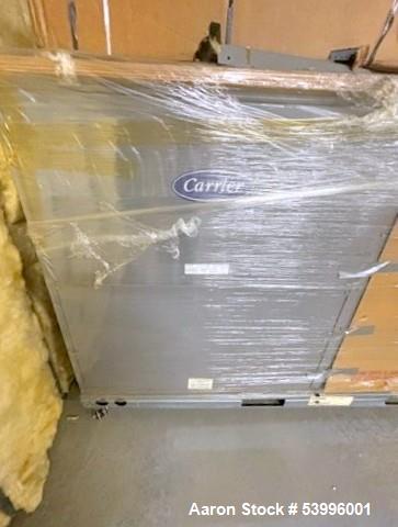 Unused- Carrier Air Conditioning Unit, Model 48TJE012-601GA. 10 ton nominal capacity. R-22 Refrigerant, approximately 5lb 13oz charge per circuit. Copper tubes, aluminum fins. Condenser coil has 2 rows 17 fins. 17.42 square foot total face area. Evaporator coil has 3 rows 15 fins and 10 square foot total face area. (2) 22" diameter condenser fans, driven by 1/4hp motors, 7000cfm. 3/60/460V Requirements. Serial# 1095G30696.