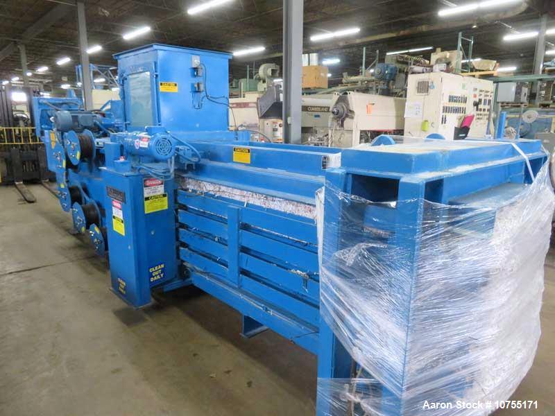 Used- Enterprise Baler Company Baler, Model E2RRB16/16-300RHBSD. 31" x 45" x 62" approximate finished bale size; 351 tons total bale ejector ram force; 3500 psi maximum operating hydraulic pressure; 16" gathering/baling ram cylinder bore; 426 psi gathering/baling ram force (face); 351 tons total gathering ram force; 16" bale ejector cylinder bore; 664 psi bale ejector ram force (face); 72" x 132" loading chute opening. Features include: Gathering/baling ram; 16" bale ejection ram; Pumping unit (1800 gallon reservoir oil capacity); Automatic wire tyer; main blower panel; Enlarged baler loading hopper; Shear knives; Operators control panel; Programmable process controller; Conveyor. Bale density, weight, and production rate varies based on material. OAD: 34'7" L x 17'3" W x 8'4" H. 300 HP, 1/60/120V. Built 2007. Previously used to make aluminum/steel bales.
