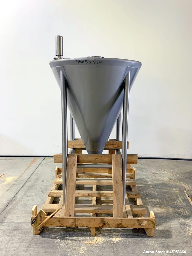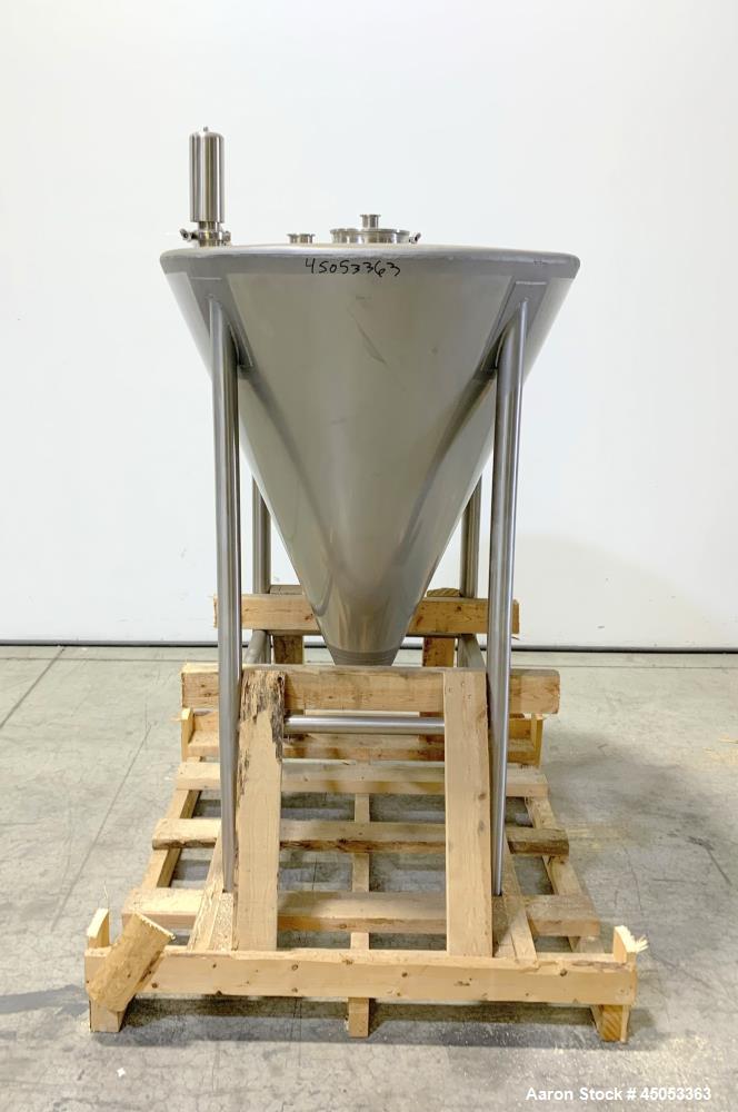 Used- Storage Bin, 304 Stainless Steel, Approximately 600 gallons, Vertical. Approximately 47" diameter x 76" straight side, 32" long cone. Dish Top, Coned Bottom. Openings top: 16" manway with (2) 1-1/2", 1" threaded openings on flange, (2) 4" with sight glass, 2-1/2" side top opening. 16" Diameter center bottom outlet. Side lug mounted.