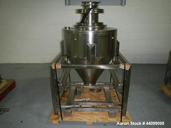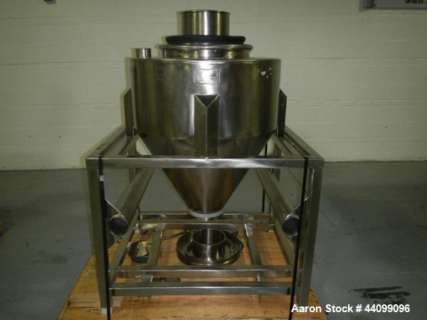 Used Zanchetta (IMA) T Tote Bin, approximately 10.5 cubic feet (300 liter) (79.2 Gallons), Stainless Steel. 40" diameter x 4" straight side x 24" cone bottom. 15 top opening, 6" discharge. Mounted on a stainless steel frame.