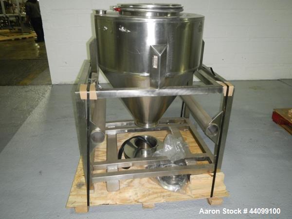 Used B&G Stainless Steel Tote 9.5 cu ft Capacity, approximately 32" diameter x 14" straight side, x 20" cone bottom, 18" top port, 1" top nozzle, 8" bottom outlet on legs.
