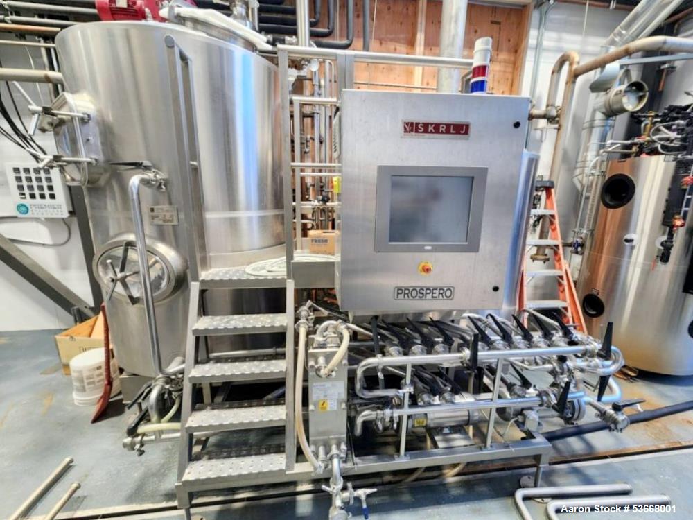 Used- Prospero SK Steam Brewhouse, Model BH3. 7BBL/10HL nominal volume; 3 vessels: 5.6 BBL mash mixer/lauter tank; 9.7 BBL whirlpool; 11.9 BBL kettle. Stainless steel construction; Steam jacketed vessel; Multi-step infusion mashing. Components include: Heat exchanger; pump; control cabinet w/ touch screen PLC; integrated process piping; grist case; platform with stairs and guard rails; rake plow with drive unit. 3/60/230V. Built 2018.