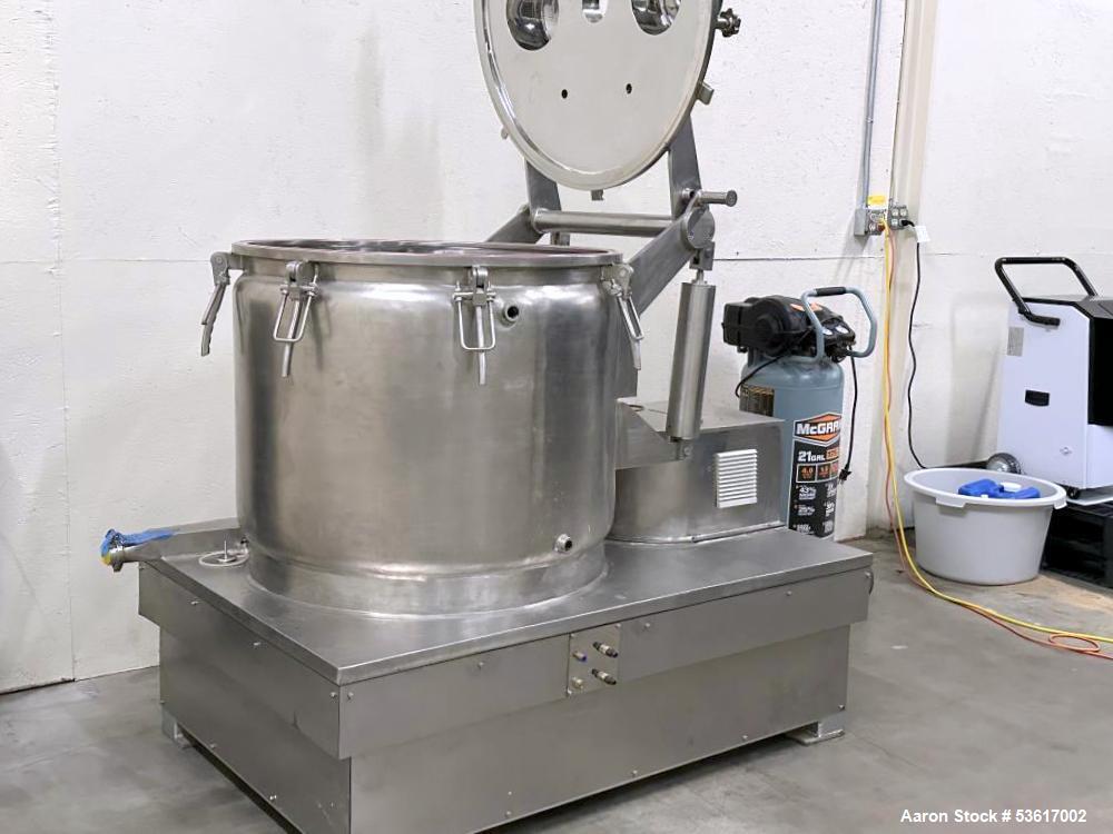 Used Delta CUP-15 Ethanol Centrifuge System | 300 lbs/Day | 304 & 316L Stainless | Closed Loop | -40C to 60C | 230V | Includes Kegs, Hoses & Adaptors. Capable of processing up to 300 pounds per day (8 hour shift). 304 and 316L stainless steel contact parts. Closed loop system. Approx. 8-14 lbs. of material processed per batch. 10-20 minute avg. run time. Vacuum jacketed insulation. -40 degrees C/60 degrees C min./max. temperature. 0 PSI max. pressure. 12-15 lbs. max. basket capacity. 230V. Includes two transfer kegs, hoses, and adaptors.